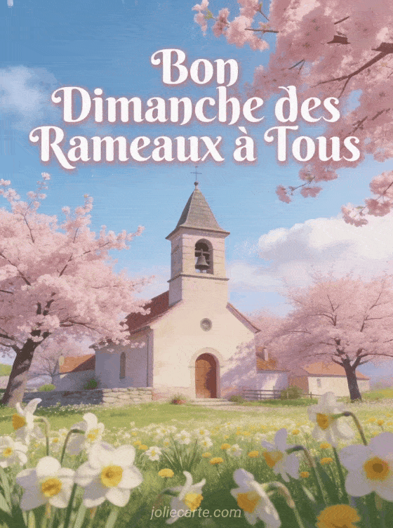 Partagez cette image « Bon Dimanche des Rameaux à Tous » avec son clocher printanier. Explorez aussi un bonjour avec vitrail, les bisous des Rameaux ou une croix fleurie.
