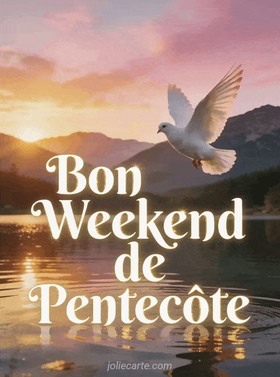Envoyez cette image « Bon Weekend de Pentecôte » avec sa colombe survolant un lac paisible. Découvrez aussi un week-end printanier, un lundi ensoleillé ou un dimanche religieux.