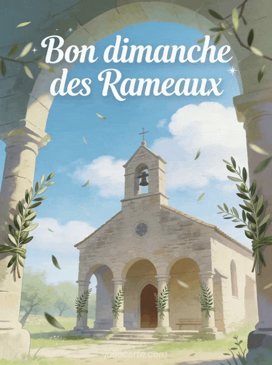 Envoyez cette image « Bonjour et Bon Dimanche des Rameaux » avec sa croix décorée. Explorez aussi une image avec clocher, une carte avec vitraux ou des images avec colombe.