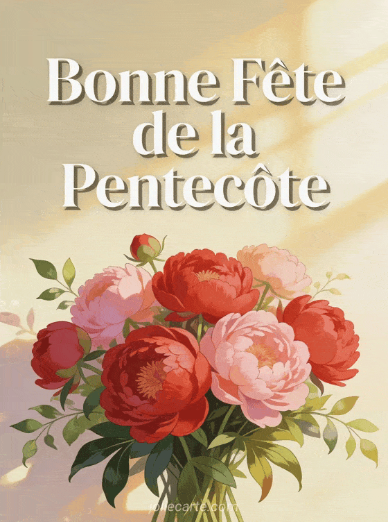 Souhaitez une « Bonne Fête de la Pentecôte » avec cette image aux pivoines délicates. Parcourez aussi un lundi de Pentecôte, une carte humoristique ou des voeux de paix.