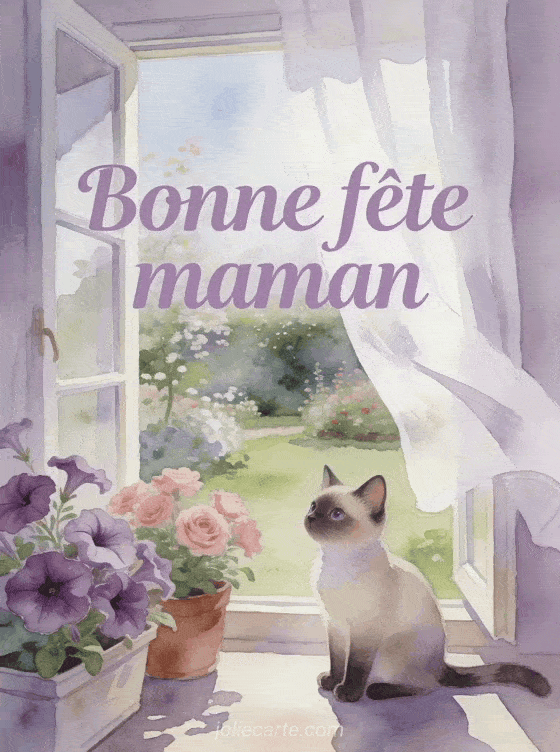 Partagez cette image « Bonne fĂȘte maman » avec un chat siamois et des pĂ©tunias Ă la fenĂȘtre pour une fĂȘte des mĂšres paisible. Voir aussi une carte gourmande, une carte bonne fĂȘte, ou des fleurs fĂȘte des mĂšres.