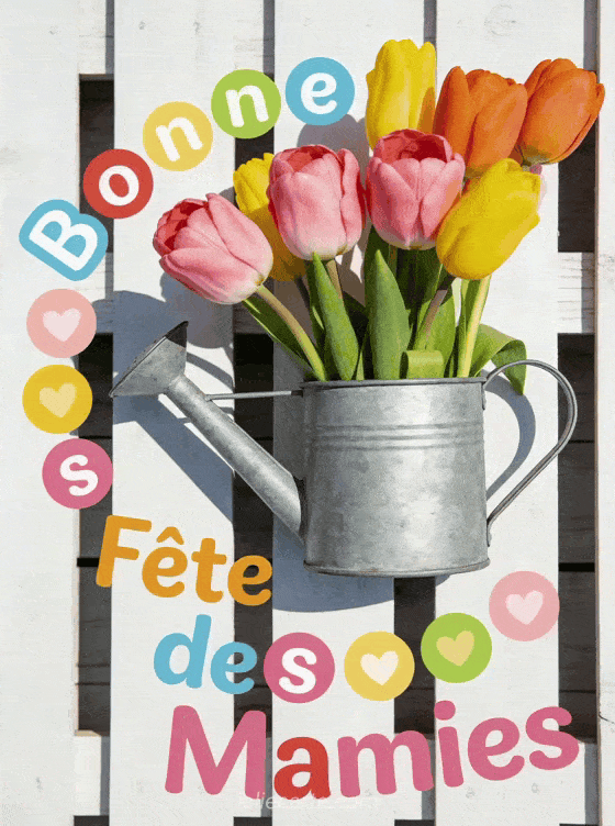 Partagez cette colorĂ©e image « Bonne FĂȘte des Mamies » avec ses tulipes dans un arrosoir vintage pour Ă©gayer la journĂ©e de mamie. DĂ©couvrez aussi une fĂȘte au goĂ»ter, une attention printaniĂšre ou une cĂ©lĂ©bration au jardin.