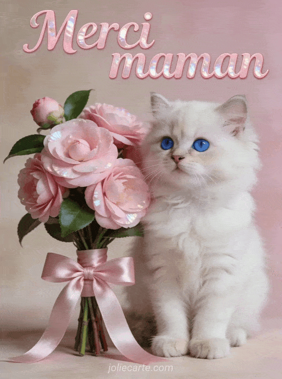 Partagez cette photo « Merci maman » avec un adorable chaton persan et des camĂ©lias roses pour remercier votre maman d'amour. DĂ©couvrez aussi une carte joyeuse fĂȘte, une image festive, ou une invitation maman.