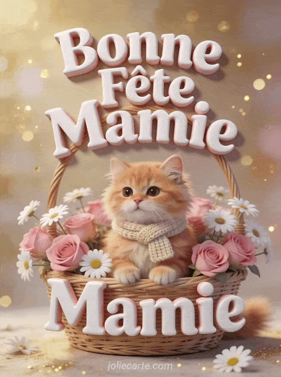 Offrez cette mignonne image « Bonne FĂȘte Mamie » avec son chat roux dans un panier de fleurs. Pour varier les plaisirs, dĂ©couvrez aussi une carte fĂȘte des mamies, une image fĂȘte grand-mĂšre ou une carte chaque pas un trĂ©sor.