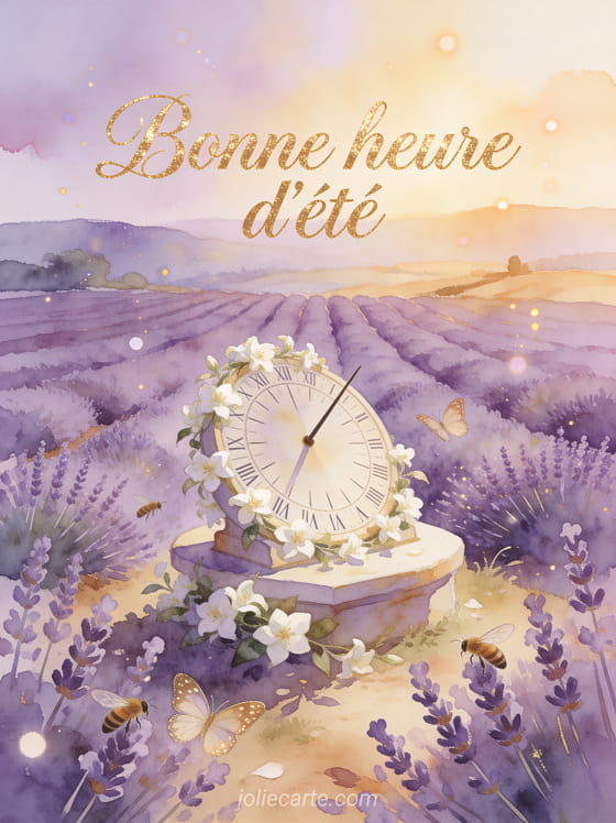 Souhaitez une bonne heure d'été avec cette magnifique image aux couleurs provençales. Pour varier les plaisirs, découvrez une image vive l'heure d'été, une carte passage à l'heure d'été ou une image bon changement d'heure.