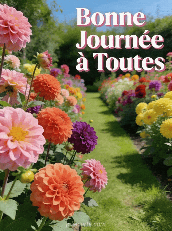 Partagez cette carte « Bonne JournĂ©e Ă Toutes » avec un jardin de dahlias Ă©clatants pour cĂ©lĂ©brer le 8 mars. Voyez aussi une carte bonne fĂȘte journĂ©e de la femme, une carte aux tournesols ou une carte aux cerisiers en fleurs.
