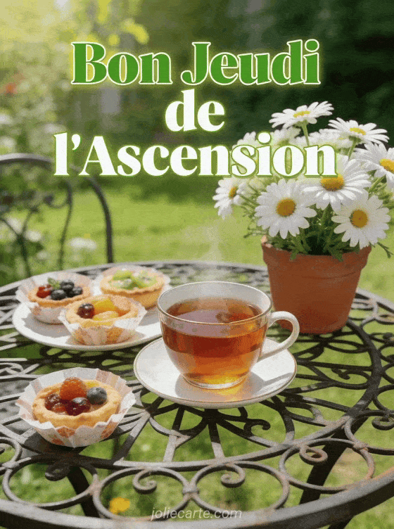 Partagez cette image « Bon Jeudi de l'Ascension » avec une tasse de thĂ© et des marguerites au jardin. DĂ©couvrez aussi un jeudi fleuri, une fĂȘte bĂ©nie ou une bonne journĂ©e.