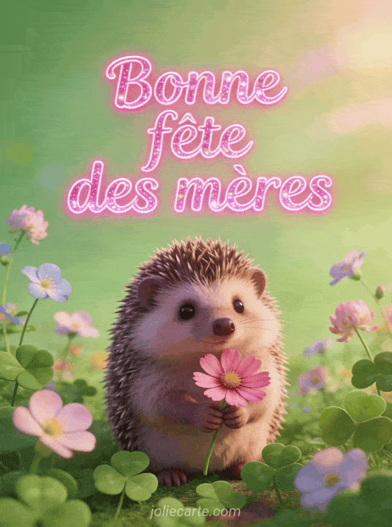 Partagez ce gif « Bonne fĂȘte des mĂšres » avec un adorable hĂ©risson tenant une fleur de cosmos pour une attention craquante. DĂ©couvrez aussi des mots doux pour maman, une photo fĂȘte des mĂšres, ou une carte joyeuse fĂȘte.