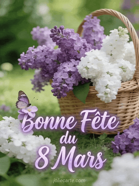 Offrez cette carte « Bonne FĂȘte du 8 Mars » avec un panier de lilas et un papillon pour cĂ©lĂ©brer les femmes. Retrouvez aussi une carte 8 mars aux orchidĂ©es, une carte journĂ©e de la femme ou une belle journĂ©e de la femme.