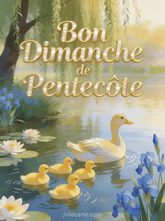 Bon Dimanche de Pentecôte une famille de canards sur un étang fleuri