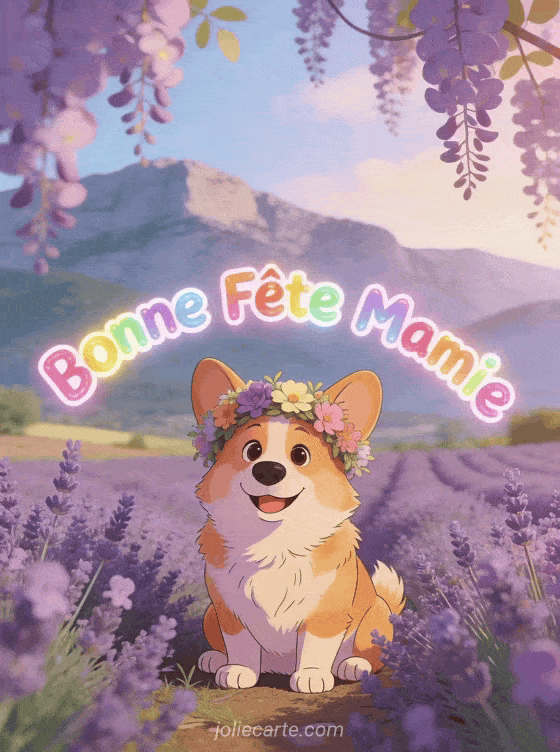 Offrez cette lumineuse image « Bonne FĂȘte Mamie » avec un corgi couronnĂ© de fleurs dans la lavande provençale. Explorez aussi une fĂȘte en forĂȘt, une attention printaniĂšre ou une cĂ©lĂ©bration florale.