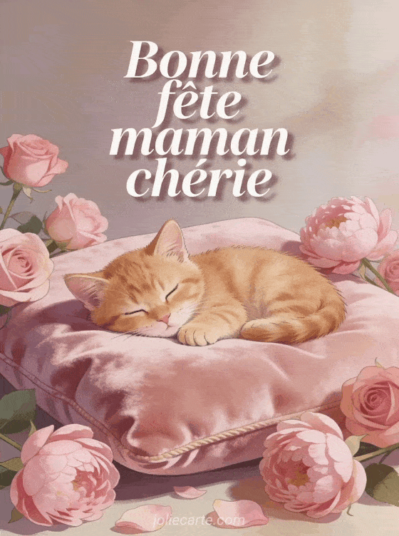 Partagez cette carte « Bonne fĂȘte maman chĂ©rie » avec un adorable chaton blotti parmi les roses pour toucher le cĆur de votre maman. Voir aussi une carte fleurie, une image fĂȘte des mĂšres, ou une carte fĂȘte maman.