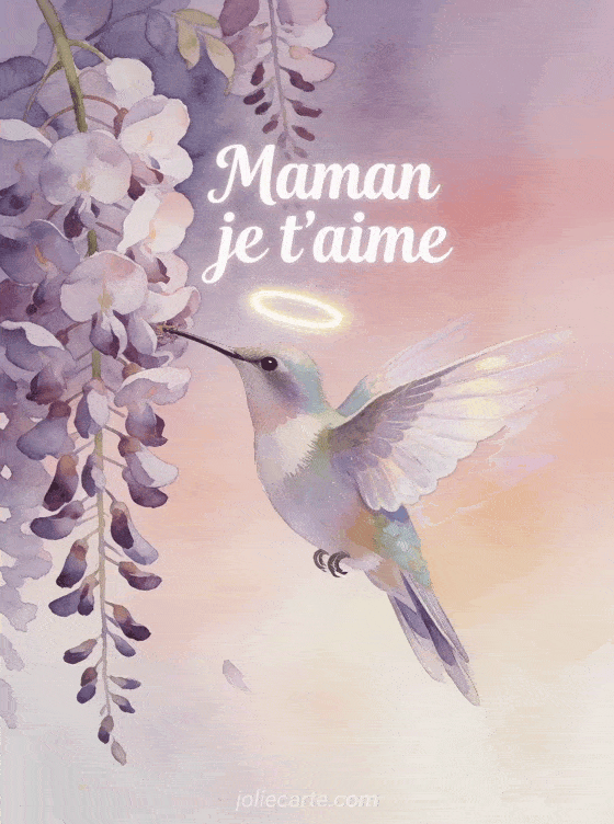 Offrez cette carte gratuite « Maman je t'aime » avec un colibri irisĂ© parmi les glycines pour une fĂȘte des mĂšres inoubliable. Voir aussi une carte bonne fĂȘte, un modĂšle pour maman, ou une carte gratuite fleurie.