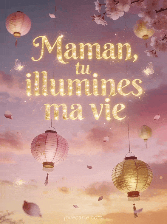 Partagez cette carte « Maman, tu illumines ma vie » avec des lanternes et des pétales de cerisier pour une fête des mères magique. Voir aussi des cartes fête des mères, une image fête des mères, ou des cartes gratuites.
