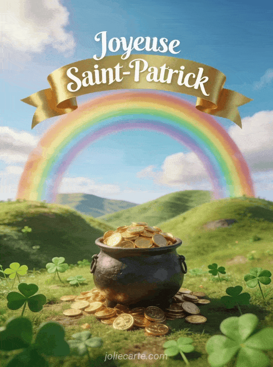 Partagez cette carte féerique avec son arc-en-ciel et son chaudron d'or pour célébrer la Saint-Patrick. Découvrez aussi une carte humoristique, une carte paysage irlandais ou une carte amusante.