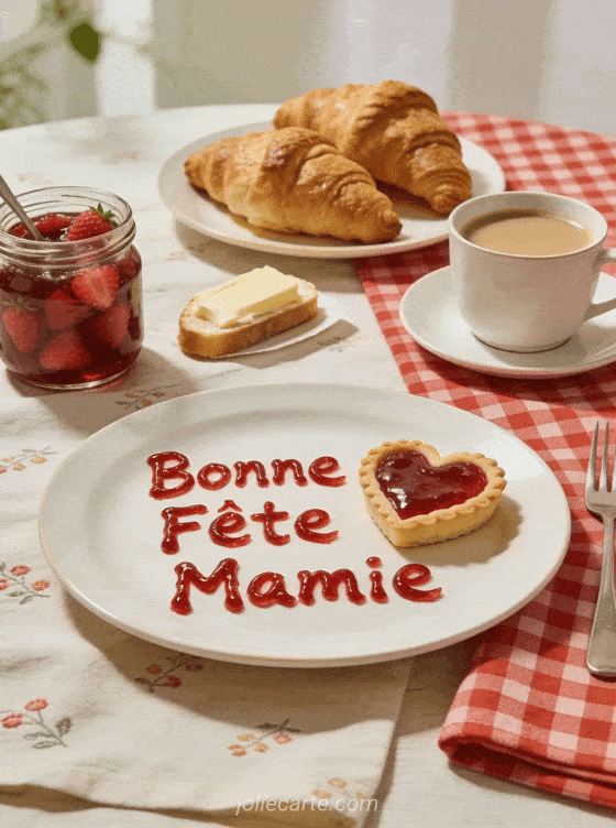 Offrez cette gourmande image « Bonne FĂȘte Mamie » avec croissants et confiture maison pour un rĂ©veil savoureux. DĂ©couvrez aussi une fĂȘte aventuriĂšre, une attention distinguĂ©e ou une cĂ©lĂ©bration musicale.