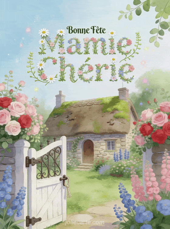 Partagez cette enchanteresse image « Bonne FĂȘte Mamie ChĂ©rie » avec son cottage et jardin de roses pour faire rĂȘver mamie. DĂ©couvrez aussi une fĂȘte cosy, une attention parfumĂ©e ou une cĂ©lĂ©bration gourmande.