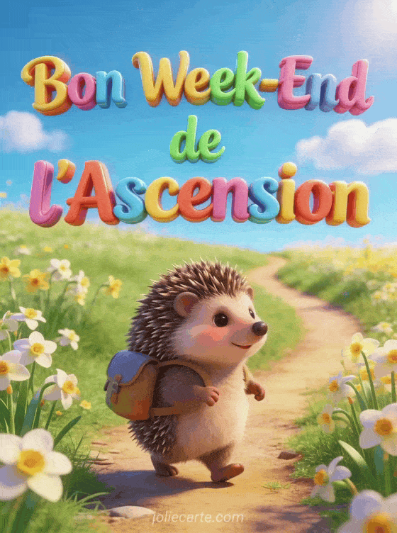 Partagez cette image « Bon Week-End de l'Ascension » avec un adorable hérisson partant en balade. Découvrez aussi un bon jeudi, une bonne journée ou une joyeuse ascension.