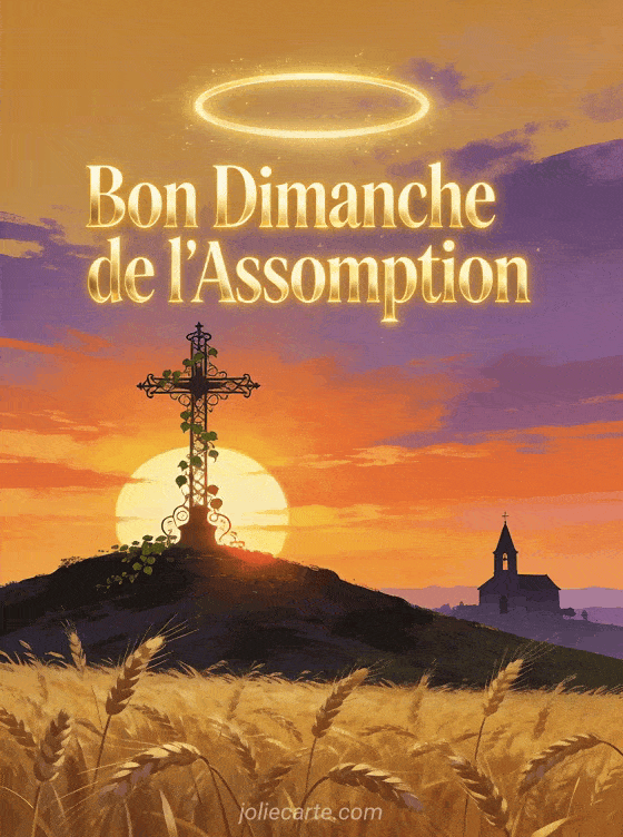 Partagez cette image « Bon Dimanche de l'Assomption » avec son coucher de soleil et sa croix pour le 15 août. Découvrez aussi une carte dimanche Assomption, une carte lundi Assomption ou une carte jeudi Assomption.