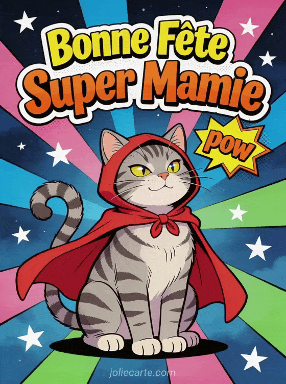 Partagez cette amusante image « Bonne FĂȘte Super Mamie » avec un chat Ă cape pour faire sourire votre super grand-mĂšre. Voyez aussi une fĂȘte florale, une attention cosy ou une cĂ©lĂ©bration nature.