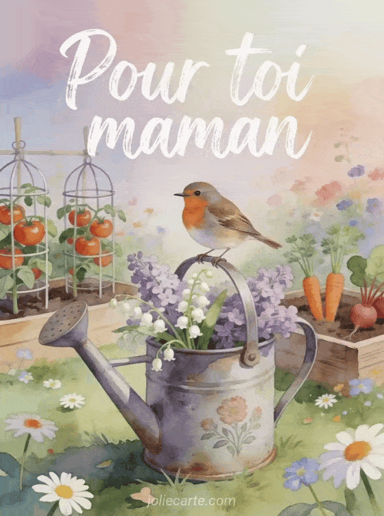 Partagez cette carte « Pour toi maman » avec un moineau posĂ© sur un arrosoir de lilas et muguet pour une fĂȘte des mĂšres pleine de charme. Voir aussi des cartes gratuites, une carte pour maman, ou des cartes fĂȘtes des mĂšres.