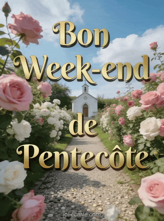 Envoyez cette image « Bon Week-end de Pentecôte » avec son jardin de roses et sa chapelle. Découvrez aussi une carte gratuite, une version humoristique ou un dimanche fleuri.