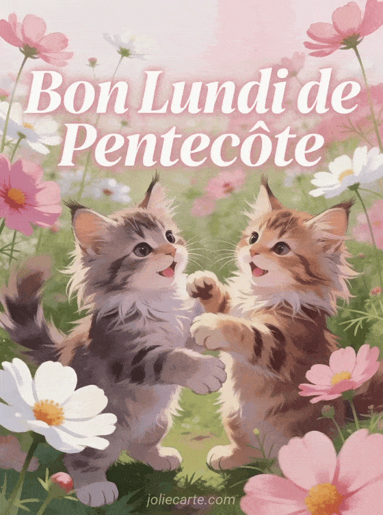 Envoyez cette image « Bon Lundi de Pentecôte » avec ses chatons dans les cosmos. Voyez aussi un bouquet champêtre, un renard ou une coccinelle.