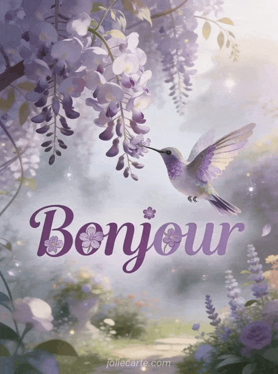 Ce colibri irisĂ© butinant des glycines apporte grĂące et dĂ©licatesse pour dire bonjour le 1er avril. Une image florale enchanteresse. DĂ©couvrez aussi un faon curieux, un bonjour champĂȘtre ou un anniversaire paisible.