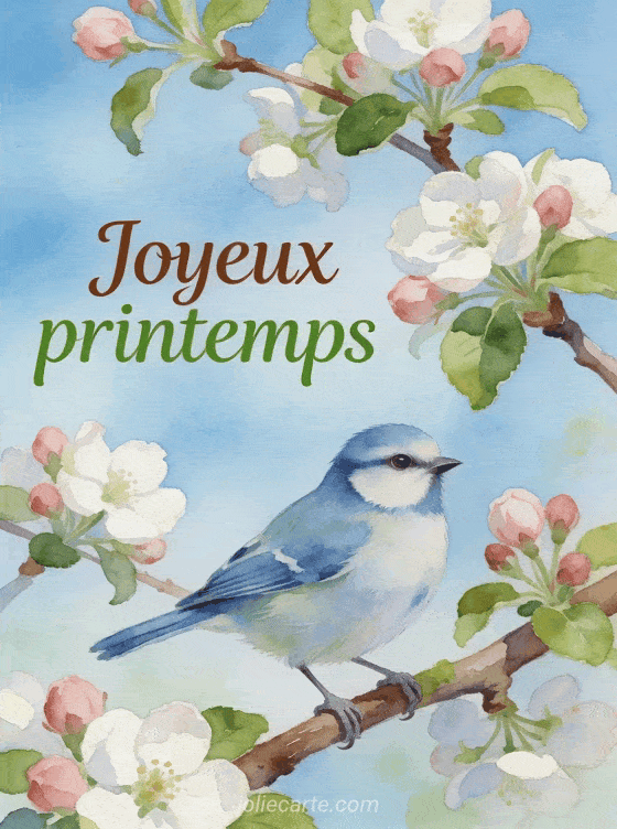 Partagez cette image de printemps avec un oiseau, un moment de douceur entre nature et renouveau. Découvrez aussi un gif animé de printemps, un gif de printemps gratuit ou des images de joyeux printemps.