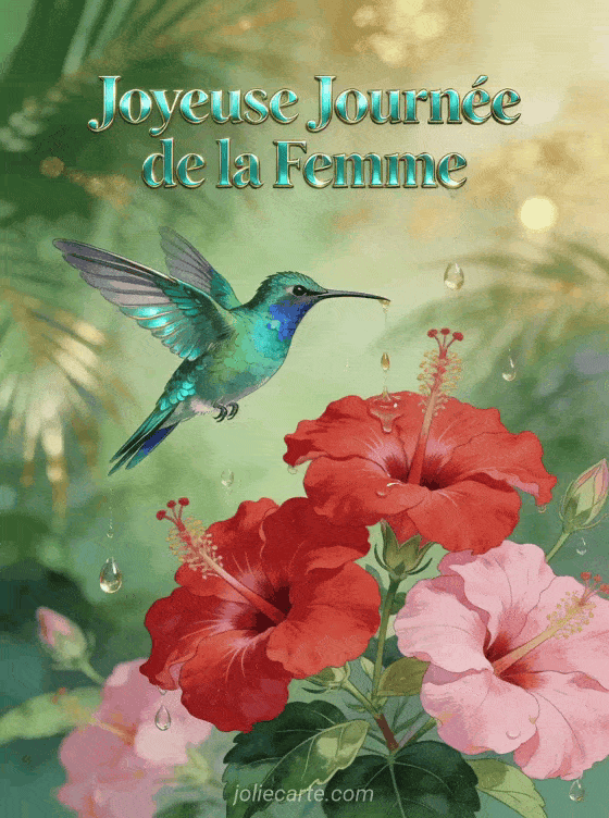 Partagez cette jolie carte « Joyeuse Journée de la Femme » avec un colibri et des hibiscus pour le 8 mars. Retrouvez aussi une carte pour maman 8 mars, une carte journée internationale ou une carte au muguet pour maman.