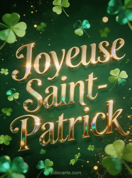 Célébrez la Saint-Patrick avec cette carte ornée de trèfles dorés et d'une ambiance magique. Pour d'autres idées, découvrez une Saint-Patrick festive, une carte irlandaise mignonne ou un message de bonne fête.