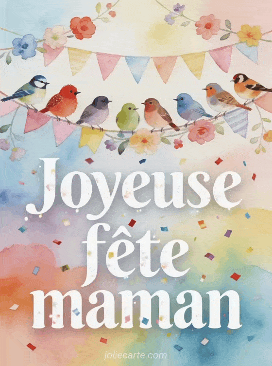 Partagez cette carte « Joyeuse fĂȘte maman » avec des oiseaux colorĂ©s perchĂ©s sur une guirlande de fanions pour une fĂȘte des mĂšres pleine de gaietĂ©. Voir aussi des images bonne fĂȘte, une carte bonnes fĂȘtes, ou des images festives.