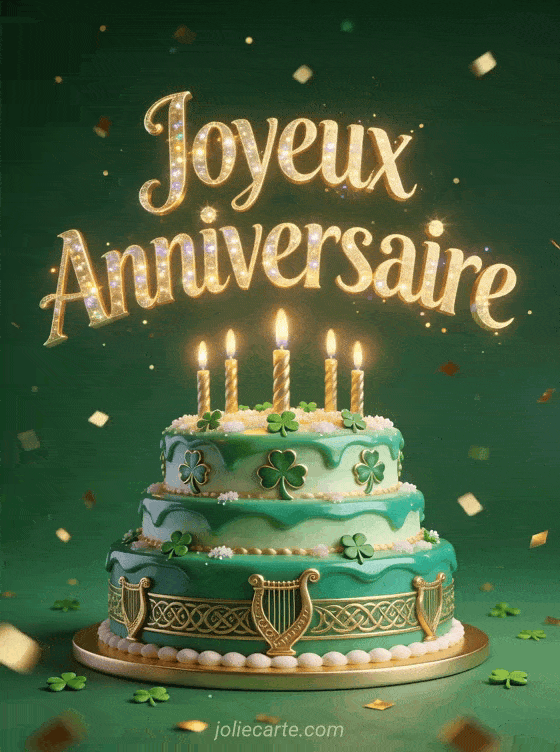 Souhaitez un joyeux anniversaire sur le thÚme de la Saint-Patrick avec ce gùteau émeraude et doré. Découvrez aussi une carte renard enchantée, une carte invitation festive ou une carte cascade irlandaise.