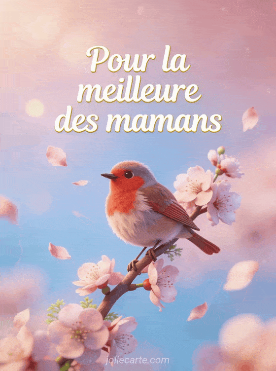 Utilisez ce modĂšle de carte « Pour la meilleure des mamans » avec un rouge-gorge sur cerisier en fleurs pour dire je t'aime Ă votre maman. Voir aussi une carte gratuite maman, une carte fĂȘte des mĂšres, ou des fleurs pour maman.