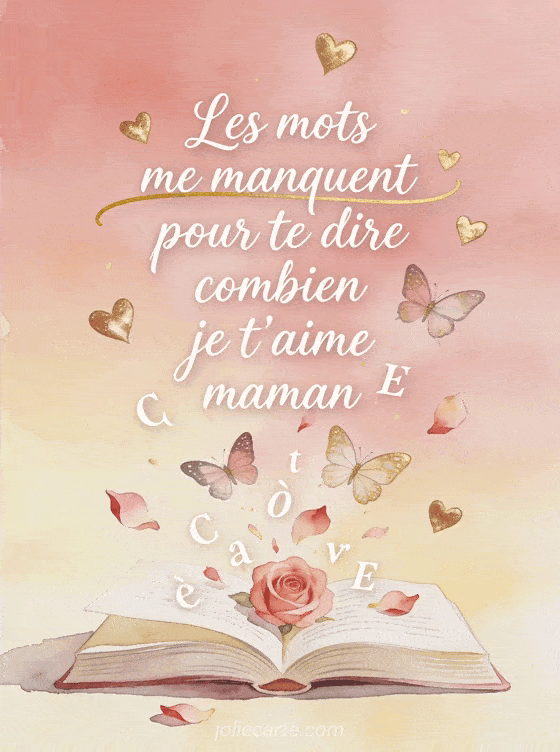 Offrez ces mots doux « Les mots me manquent pour te dire combien je t'aime » avec des lettres qui deviennent papillons pour une fĂȘte des mĂšres Ă©mouvante. Voir aussi des mots doux Ă©toilĂ©s, des mots doux tendres, ou des mots doux gourmands.