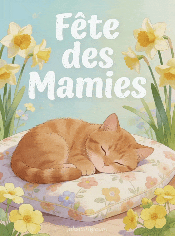 Ce petit chat roux endormi sur son coussin fleuri fera fondre le cĆur de votre mamie. Une image tendre pour la fĂȘte des grands-mĂšres. DĂ©couvrez aussi une carte fĂȘte des grand-mĂšres, une image pour mamie ou une carte bonne fĂȘte grand-mĂšre.