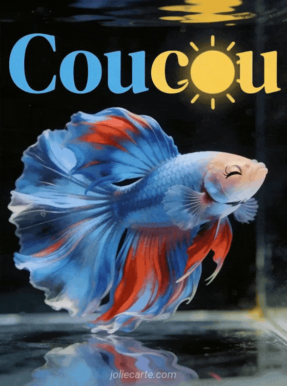 Ce poisson combattant betta aux nageoires majestueuses vous fait un coucou charmeur. Une image élégante et colorée. Découvrez aussi un gif animé, une méduse apaisante ou des poissons colorés.