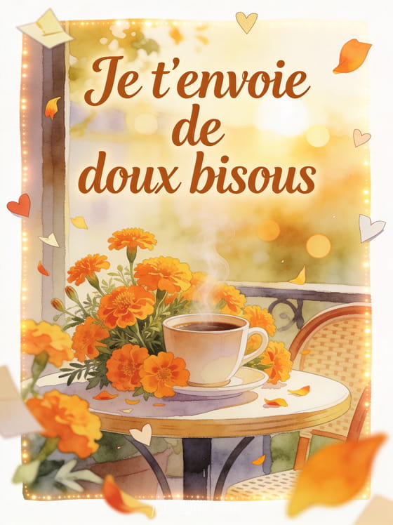 Bisous cafe d'amour donne au message une douceur intime et chaleureuse, ideale pour glisser un peu de romantisme dans le quotidien, surtout si vous y ajoutez des bisous pour ma cherie, une bonne nuit remplie de baisers pour mon coeur et une nuance tres romantique des bisous amoureux afin de garder une belle intensite.