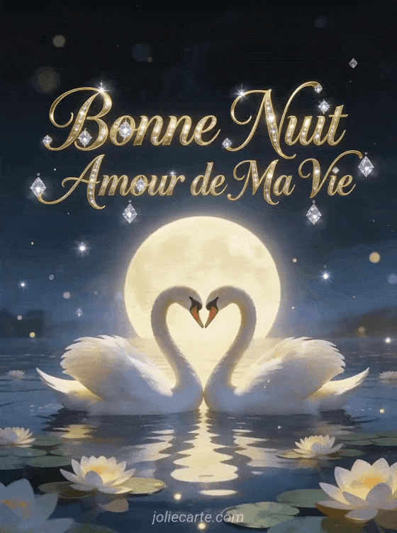 Offrez « Bonne Nuit Amour de Ma Vie » pour un message grandiose. Deux cygnes forment un cĆur sur un lac aux nĂ©nuphars sous la lune. Essayez aussi un gif romantique, une nuit chĂ©rie ou une douce pensĂ©e.