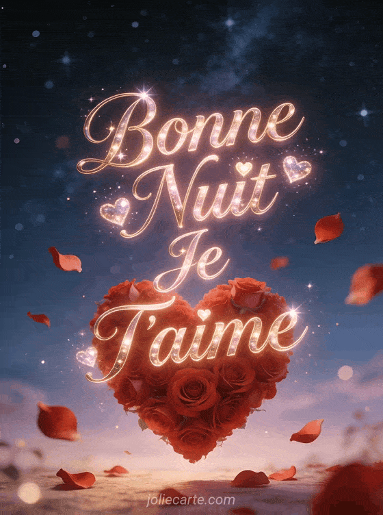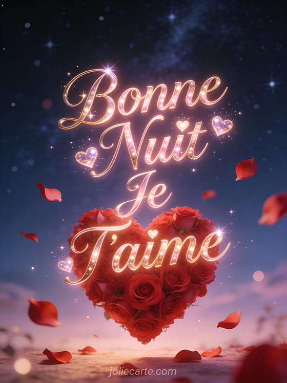 Partagez « Bonne Nuit Je T'aime » pour un message d'amour intense. Des pĂ©tales de roses dessinent un cĆur sous un ciel Ă©toilĂ©. Essayez aussi une pensĂ©e Ă distance, une nuit tendre ou une douce attention.
