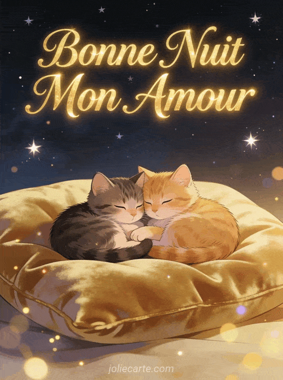 Offrez cette douce image « Bonne Nuit Mon Amour » pour accompagner votre moitié vers de beaux rêves. Deux adorables chats enlacés sous un ciel étoilé transmettent toute votre tendresse, même à distance.