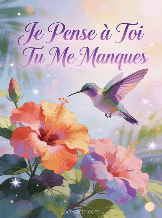 Envoyez ce gif « Je Pense à Toi Tu Me Manques » pour un double message coloré. Un colibri butine prÚs d'hibiscus tropicaux. Explorez aussi un message élégant, un texte intense ou un message féminin.