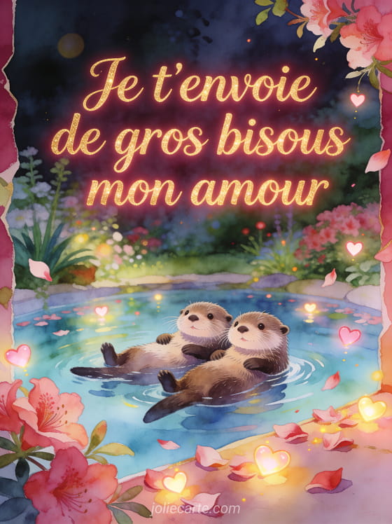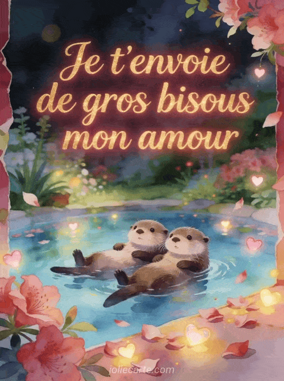 Pour partager un gros bisous mon amour gif, cette carte gratuite propose un message affectueux, direct et tres tendre. Elle peut s'accompagner de un gif d'amour fou et de bisous, des images de bisous passionnes et une image de bisous amoureux pour renforcer votre declaration avec chaleur.