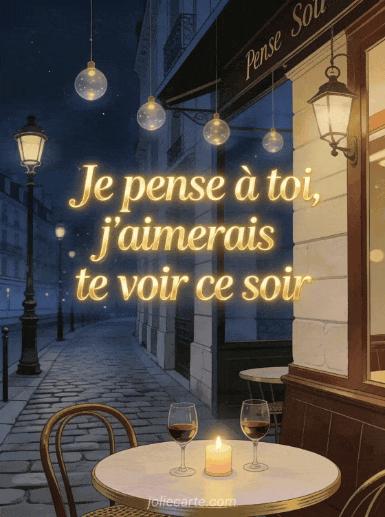 Envoyez cette image « Je pense à toi, j'aimerais te voir ce soir » pour proposer un rendez-vous. Variez avec un message nostalgique, une pensée constante ou une image fleurie.