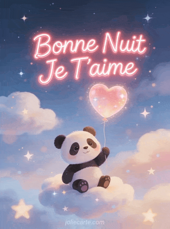 Envoyez ce gif « Bonne Nuit Je T'aime » pour un message animĂ© plein de charme. Un panda adorable flotte parmi les nuages avec son ballon cĆur. DĂ©couvrez aussi un message doux, un sms tendre ou un je t'aime Ă©toilĂ©.