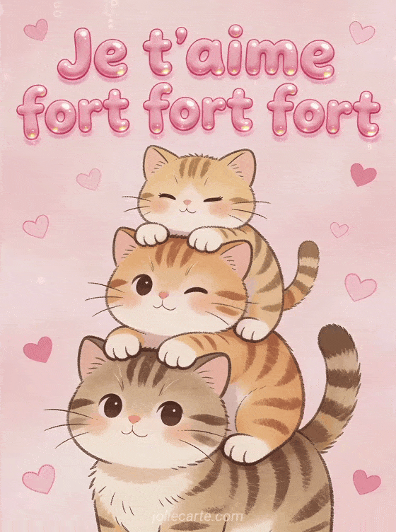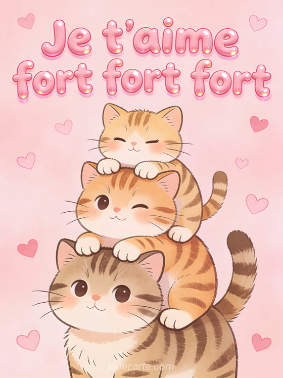 Partagez cette image « Je t'aime fort fort fort » avec trois chatons empilés irrésistibles. Voyez aussi la phrase moins qu'hier plus que demain, un je t'aime jusqu'à la lune ou un je t'aime passionnément.