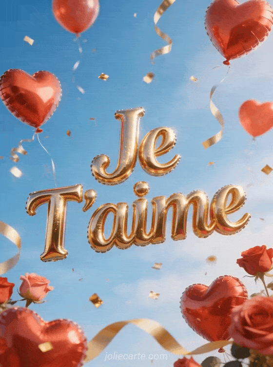 Envoyez cette image « Je T'aime » avec des ballons en cĆur et des confettis dorĂ©s dans le ciel. Essayez aussi un je t'aime lune, des colibris amoureux ou un ours en peluche.