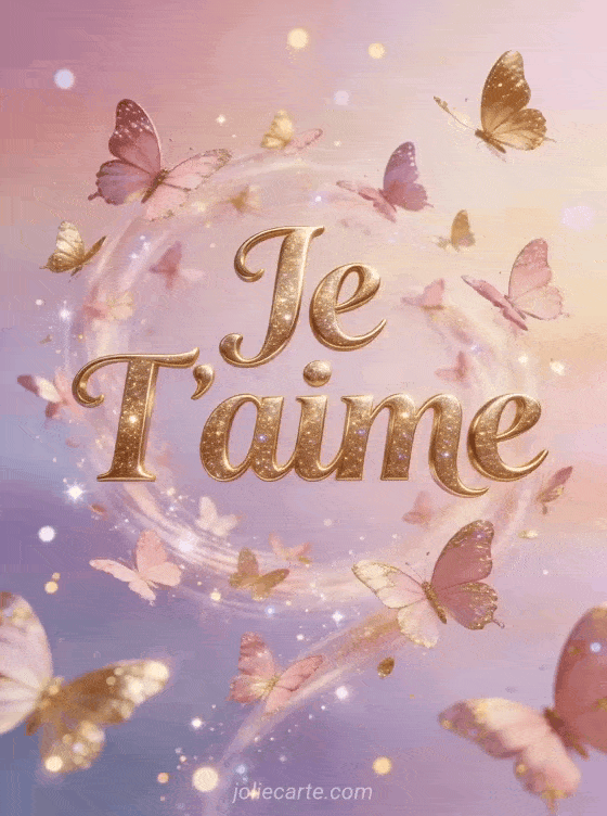 Envoyez cette image « Je T'aime » avec un tourbillon de papillons roses et dorés scintillants. Essayez aussi des camélias délicats, des flamants roses ou un texte d'amour.