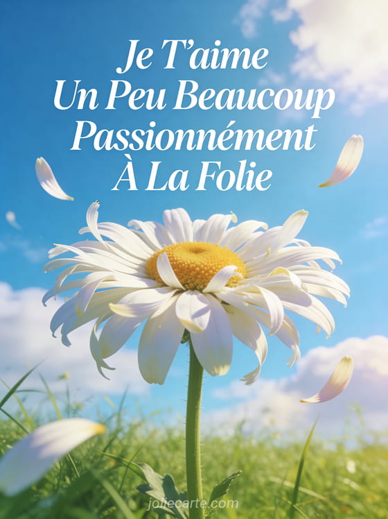 Offrez ce poème « Je T'aime Un Peu Beaucoup Passionnément À La Folie » avec une marguerite effeuillée au vent. Voyez aussi un chiot romantique, des lanternes dorées ou un lapin fleuri.