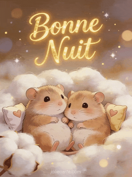 Partagez cette image « Bonne Nuit » pleine de tendresse. Deux hamsters adorables se font un cùlin amoureux dans leur nid douillet. Essayez aussi un poÚme d'amour, un gif je t'aime ou une image à distance.